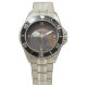 Has heft and feel of expensive stainless steel quartz watches. Good band with safety catch. I removed links, which is easy because engraved arrows show direction to push the linking pins. As always by this seller, the image (a railroad logo) is a perfect reproduction of my emailed image, and is precisely spaced and aligned.