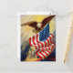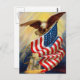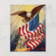 This beautiful bald headed eagle with a American flag flying over the world and a beam of light shinning on him with his wing wide open on his head an a black background around him.