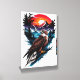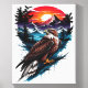 Digital illustration of a red-tailed hawk perched on a blue splattered rock. The hawk has detailed brown and white feathers, yellow talons, and a sharp yellow beak. Behind it, a vibrant sunset with a red-orange sky, silhouetted pine trees, and snow-capped mountains. The background features dynamic brush strokes and splatters, blending realism with abstract art styles. The overall color palette includes rich browns, whites, blues, and reds.