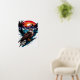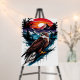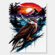 Digital illustration of a red-tailed hawk perched on a blue splattered rock. The hawk has detailed brown and white feathers, yellow talons, and a sharp yellow beak. Behind it, a vibrant sunset with a red-orange sky, silhouetted pine trees, and snow-capped mountains. The background features dynamic brush strokes and splatters, blending realism with abstract art styles. The overall color palette includes rich browns, whites, blues, and reds.
