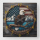A majestic eagle stands on a branch, set against a backdrop of the American flag and mountains, embodying strength and freedom.