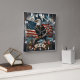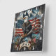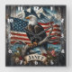 An eagle stands majestically on a branch, framed by the American flag and mountains in the background, symbolizing patriotism and freedom.