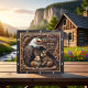 This highly dimensional square wall clock features a close-up illustration of a brown eagle with a determined expression and a white, smiling rabbit sitting closely together. The entire design is rendered in muted brown, tan, and dark leather-like tones, strongly suggesting a deep sculpted relief or Sculpted Leather Look. The eagle is perched on the left, displaying detailed feathers, while the rabbit is on the right, appearing cheerful with long ears and textured fur. They are framed by a prominent, circular wreath of stylized leaves and branches carved into the perimeter. The background features detailed rocky terrain and stylized trees. The large, three-dimensional embossed text "BESTIES FOR LIFE" is carved across the top center in a bold, golden serif font. The clock face features a simple clock face border with large, white, numbered tick marks (1 to 12) integrated into the outer frame. The artwork is surrounded by a thick, dark brown decorative border that resembles a black wood frame.