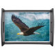 Serve with strength and purpose using this striking serving tray featuring a bald eagle soaring high above a stormy sea. The background showcases swirling abstract waves in rich shades of navy, slate, and gray—capturing the chaos and movement of life’s storms. Yet the eagle, rendered in sharp detail with white feathers, brown wings, and a golden beak, glides above it all with unwavering focus. This symbolic design brings elegance and meaning to your kitchen, dining table, or entertaining space—reminding us to rise above the noise and move with courage and clarity. Beautiful for both everyday use and special gatherings.