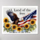 4th of July poster with a watercolor American flag, eagle, and sunflowers. Land of the free because of the brave quote.