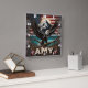 A majestic eagle stands on a branch with its wings spread wide, set against a backdrop of mountains and an American flag, symbolizing strength and freedom.