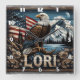 An eagle perches proudly on a branch, showcasing its strength against a backdrop of mountains and the American flag.