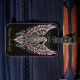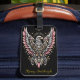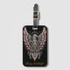 A stylized eagle with pink and gold plumage, its wings spread wide. The design is intricate and ornate, with a black background.