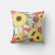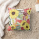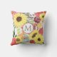 Here's a pretty throw pillow with a bold floral pattern in colors of pink, violet, soft green, brown and bright yellow. Big bright sunflowers are the main attraction.The colorful pattern is placed on a white background. The back of the pillow has the same pattern, but with a white circle banner lined in matching violet pink and gray green. Your monogram is at the center.