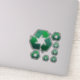 Stickers showcases green faux glitter universal recycling symbol. Sticker sheet features three sizes of the same sticker: four tiny, two small, and one large. Available in a couple other sparkly colors.