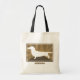 Three wooden, earthy tones make up this funky Dachshund tote bag. The dog breed's silhouette is in the center, with radical angles in the background. Below is the breed name. Cool Dachshund gifts for dog lovers.
