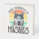 Easily Distracted By Huskies. This funny & cute husky accessory is a perfect dog lover gift for men, women, teens & kids who own and love a Siberian husky. If you’re the proud owner of a pet Siberian husky or Alaskan malamute, and you love dogs & huskies, this design is for you! Includes a graphic of a smiling husky dog set against a retro vintage distressed sunset background.