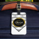 Be travel ready with this black and white zig zag luggage tag design featuring a gold glitter oval with template name and initial letter monogram text over a white bottom. Personalize the text in the template fields for both sides, remove the initial letter or name or use the edit design tool to select a font style, size, and color you like. Check out the style with the slot for a business card which is a great idea if personal details change.