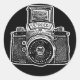 A sticker with a high contrast, high passed filtered and vectorized image of a vintage East German camera from the 1950s. Creating a strong bold toothy retro screen print. or medieval Gothic brass rubbing like effect.