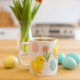 This springtime/Easter holiday coffee mug showcases a charming pattern of baby chicks and bunnies. The design also includes colorful Easter eggs and red tulip flowers.