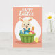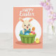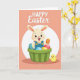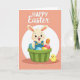 This card shows a soft peach background with a large white circle framing a light-furred bunny 🐰 with long ears, dark eyes, rosy cheeks, and a small tongue peeking out in a teasing grin. The bunny wears simple blue overalls and sits snugly in an olive-green basket, as if being gently tucked in by an unseen friend. The basket is filled with decorated eggs in blue, yellow, and pink, each patterned with dots, zigzags, and solid bands that feel like little gifts meant for sharing. Near the lower right, a small yellow chick with orange legs trots forward, angled toward the basket as though following the bunny with affectionate curiosity 🐇. Soft, diffuse lighting and light shadows under the basket and chick give the illustration a mild sense of depth while keeping the look smooth and tidy. Across the upper area, a flowing dark inscription is placed prominently, standing out clearly against the peach-toned space. The chick’s beak is slightly open and its bright eye is turned toward the basket beside a cluster of patterned eggs.
