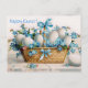 A beautiful wicker basket filled with white eggs and surrounded by the brightest blue little flowers with a few pink ones here and there. The blue ribbon matches the flowers perfectly. This type of Victorian print was popular in the early 1900's.