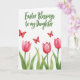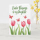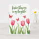 This card features a bright white background with a small spring scene arranged low on the front, where three pink tulips open gently as if leaning toward one another like close friends 🌷. Their green stems and long curved leaves sweep outward, adding a soft sense of motion and balance. Above the flowers, three ruby-red butterflies drift across the open space, their wings lightly detailed with fine lines that make them look mid-flutter 🐇. The overall layout feels airy, with lots of white space that keeps the focus on the flowers and butterflies. Near the top, a line of green flowing lettering is centered and reads “Easter Blessings to my Daughter,” standing out clearly against the pale background. The green text echoes the tulip stems below, tying the message to the garden colors without crowding the artwork. The butterflies hover above the tulips in a loose triangle, with one slightly higher and the other two spaced apart to the left and right.