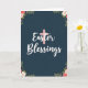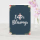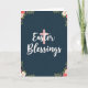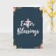 This greeting card features the words “Easter Blessings” centered in smooth, flowing white lettering on a deep navy background, drawing your eye right away. In the word “Easter,” the letter “T” is replaced with a pastel pink cross, adding a gentle spiritual touch without overpowering the design. The text sits in the middle with generous spacing around it, giving the message room to breathe and feel calm. In each corner, soft floral clusters curl inward like they’re leaning closer, creating a tender, welcoming frame 🌷. The blossoms mix blush pink and creamy white petals with a few deeper red flowers, suggesting a quiet closeness like a shared springtime moment between friends. Green leaves and small yellow accents weave through the corners, adding warmth and a fresh, early-spring look 🐰. The dark background makes the pale flowers and white lettering stand out, while the pastel pink cross remains the most noticeable detail within the central line of text. Four corner bouquets—top left, top right, bottom left, and bottom right—surround the centered message against the navy field.