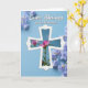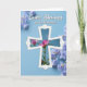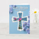 This greeting card features a crisp white cross with a lightly textured, slightly ornate look, standing like a window at the center of the design. Inside the cross, a single bright pink blossom with tender petals and fresh green leaves leans toward the light, suggesting a gentle closeness like two newlyweds drawn together 🌷. The background behind the flower is a soft sky-blue, keeping the focus calm and airy. Around the cross, the scene fades into a soft blur of lavender and periwinkle flowers, as if the couple’s world is surrounded by quiet support. Across the top, white lettering reads “Easter Blessings for the Newlyweds,” placed in a graceful line that arches slightly above the cross. The contrast between the sharp white cross and the hazy floral border creates depth, like a clear promise held within a tender, dreamy garden 🐇. Pale purple blossoms and cool blue tones wash outward from the center, with the pink flower standing out brightly against the blue sky.
