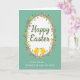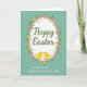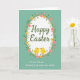 Designed with a soft spring look, this digital illustration centers on a bright white oval framed by a detailed wreath of slender green vines, leaves, and flowers in gentle pinks and sunny yellows 🌷. Inside the oval, the words “Happy Easter” sit near the top in deep green, flowing lettering that stands out against the white space. Beneath the greeting, two small, round yellow chicks with tiny orange beaks and feet lean close together, their near-touching sides suggesting a sweet bond like close friends or a loving couple 🐰. The floral ring feels airy and full, with blossoms spaced around the oval so the eye keeps circling back to the pair of birds. Behind everything, a muted teal background sets off the pastel flowers and the warm yellow of the chicks without overpowering them. Along the bottom edge, the line “TO MY DEAR GRANDSON AND HIS WIFE” appears in clear white uppercase text, centered and easy to read. The wreath shows soft pink petals and yellow blooms nestled among small green leaves around the white oval.