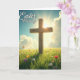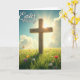 This card features a large, weathered wooden cross with visible grain, standing tall against a wide sky washed in soft blue with warm amber near the horizon. A bright burst of sunlight glows from behind the crossbeam, sending long golden rays through pale, airy clouds. Below, a spring meadow stretches out in fresh green grass that looks lightly dewy, dotted with small wildflowers in red, orange, white, and pink 🌷. A single butterfly with orange wings hovers in the mid-ground, adding a gentle sense of motion, like a quiet hello shared between close friends 🐇. In the upper left area, the words “Easter Blessings” appear in flowing lettering, set in a light tone that stands out against the sky. The strong, earthy wood contrasts with the open, glowing heavens, creating a calm scene that feels tender and close. The cross sits centered in the composition, while the sun rays fan outward and the flowers scatter across the lower half in a natural, sprinkled pattern.