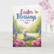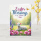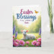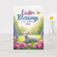 This greeting card features a gentle spring scene with a young, woolly white lamb resting in fresh green grass, its calm gaze and slightly turned head giving the moment a tender, close-to-the-heart feel 🐰. Across the top, the message “Easter Blessings to my wonderful Sister” is set in flowing lettering, with the first words in bright magenta and the remaining lines in deep blue. A small golden butterfly hovers near the top right corner, adding a light, affectionate accent. In the foreground, pink blossoms with warm yellow centers and tall lavender flower spikes rise around the lamb, like a soft floral frame. The lamb’s ears show faint pink at the tips, a sweet detail that pairs nicely with the nearby petals 🌷. Behind it all, a sunlit background fades into golden, out-of-focus circles over leafy greens, suggesting a quiet morning shared with someone dear. The flowers cluster most densely along the lower edge, while the butterfly sits alone against the bright upper right sky.