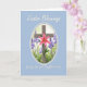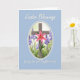 This card features a glowing oval scene centered on a warm gray cross with a lightly weathered, wood-like texture. Curled closely around the base and rising along one side is a coral-pink lily, its veined petals and pollen-tipped stamens leaning toward the cross like a gentle embrace 🌷. Behind them, a softly blurred meadow spreads out in layered greens with tall purple flower spikes that suggest early spring. The oval is edged with a thin white border and sits on a smooth, pale blue background that keeps the focus on the central image. Near the top, the words “Easter Blessings” appear in white, flowing lettering, spaced neatly above the oval. Below the scene, “for my Son and Daughter-in-law” is written in the same white, flowing lettering, centered and slightly smaller, adding a tender, family-focused touch 🐇. The coral lily stands out against the muted cross while the purple spires fade softly into the distance behind the oval.