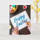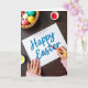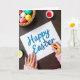 This card shows a high-angle view of a white sheet of paper on a dark wooden tabletop, where one hand with pink-painted nails steadies the page while the other guides a slim yellow paintbrush as if finishing a careful note. The words “Happy Easter” sit centered on the page in strong cerulean blue lettering, giving the scene a fresh spring look 🌷. Nearby, small paint pots with white lids are open to reveal bright red and sunny yellow paint, suggesting more touches are about to be added. In the upper left corner, a woven basket holds decorated eggs in soft pink, warm yellow, crisp white, and cool turquoise, with a few light speckles for texture 🐰. A plush pink sweater cuff peeks into the frame, adding a cozy, close-to-you feel, like someone making something sweet for a friend. The lighting is gentle and even, with soft shadows that keep the focus on the brush tip and the blue lettering. The basket sits at the top left, the paint pots cluster near the paper, and the cerulean “Happy Easter” remains the clear focal point against the dark wood grain.
