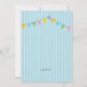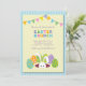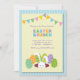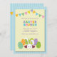 An invitation to Easter brunch, in beautiful pastel colors, featuring a bunny coming out of his burrow with Easter eggs and colorful flags against a blue striped background.