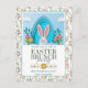 The playful central illustration is accented by vibrant pink and yellow paper-style flowers and lush green leaves, all framed by a delicate, full-bleed floral border. With its bright, airy feel and whimsical aesthetic, this invitation is the perfect way to set the stage for a Sunday brunch, a garden party, or a festive neighborhood egg hunt.