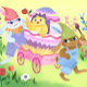 Two delightful Easter bunny rabbits parade down a colorful spring path of blooming flowers, accompanied by a painted Easter egg and a fuzzy yellow chick.