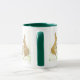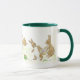 A white mug with a dark green handle and lip with a design of Easter Rabbits hiding Easter Eggs, from a handpainted design by Judy Adamson.