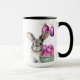Cute grey and white Easter bunny with cerise and electric purple polka dotted Easter eggs in a seafoam green basket- along with two easter eggs hanging from the top of this Easter coffee mug. Customize the front and center of this Easter themed bunny mug with your name. Change the font and color of the font if required. Enjoy! This makes a great Easter gift.