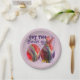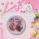 Paper plate fun design with Easter holiday theme, a colorful painted Easter bunny sitting next a big egg identically painted. The bunny has a round belly so it looks like he is an egg with a bunny disguise or an egg with big ears and short legs. It looks quite funny with the message "Got two Easter eggs". The painting pattern is a lovely combination of red, green, pink, purple, cyan and there are painting traces everywhere.