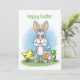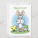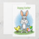 The Easter bunny and the cute chicken present the colorful Easter eggs.