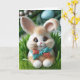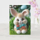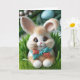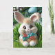 A cute bunny with large eyes and a colorful bow tie sits in a cake among vibrant green leaves made of frosting.