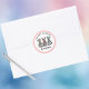 This playful Easter bunny round sticker has a cute and playful checkerboard design with the rear profile of 3 cute bunnies and their cotton tails, decorated in a checkerboard pattern. Each bunny is a different color alternating with black squares: mint green, pink, and a soft blue-teal color. A pink border surrounds the cute rabbits. The text Happy Easter appears above the 3 bunnies in a playful font, with a strip of classic black and white squares, with your family's name or message in a pretty script font below. Make sure to type the name in the Personalize box.