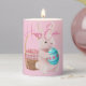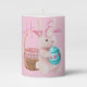This is a pillar candle with "Happy Easter" across the top of the artwork. The art is a bunny holding an Easter egg and a wooden basket with gingham trim behind it. May be personalized and fonts and images can be changed as well.