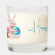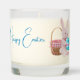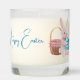This is a scented candle in glass with "Happy Easter" sentiments and Easter Bunny artwork. The art is a bunny holding an Easter egg and a wooden basket with gingham trim behind it. May be personalized and fonts and images can be changed as well. Message MineByDesign for help with designs!