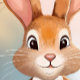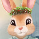 Mother Rabbit: On the right, a slightly smaller rabbit wearing a light blue dress with a darker blue sash around the waist and a small red bow tie. She also carries a basket of Easter eggs. She has a delicate floral crown on her head.