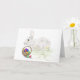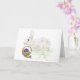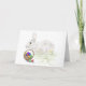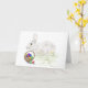 Folded greeting card with pen and ink illustration of a bunny and basket full of colorful Easter eggs.