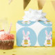 A cute Easter Bunny wearing a pink bow ribbon ever so happy holding on Easter Egg decorated in Spring colors filled with candy sitting on a patch of green grass with a robins egg blue circle. Use this to wrap a gift for a little or big girl or boy or a family or friend to wish them a Happy Easter.