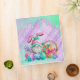 Easter Bunny Gnome with pink bunny ears sitting in spring flowers with decorated eggs and a wicker basket of carrots set on a watercolor teal and purple plaid background with pastel candy icing drips.