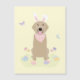 A cute illustration of a golden retriever dog wearing bunny ears and a cute Easter bandana. Surrounded by decorated Easter eggs, spring flowers and butterflies.
