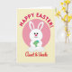 This card features a stylized white long-eared bunny with a rounded shape, tiny black eyes, a soft pink nose, and a small smile 🐰. The bunny holds an egg close to its chest as if sharing a quiet, affectionate moment, with bright blue and sunny yellow stripes wrapping around the egg. Behind the bunny sits a large blush-pink circle that frames the scene like a gentle spotlight. Near the top, the words “HAPPY EASTER!” curve in strong red letters above the illustration. Below the bunny, “Aunt & Uncle” appears in red, written in a flowing, friendly style that feels like a warm note tucked into the design 🌷. The background is pale yellow, giving everything a sunny, cozy look without overpowering the central figures. A faint grid-like crosshatch texture runs across the pale yellow field, adding subtle depth around the pink circle and the bunny.