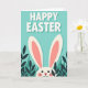 This card features a spring-themed illustration with large white “HAPPY EASTER” lettering centered near the top, styled with a subtle shadow for depth against an aqua-blue background. Below the words, a small bunny peeks up from thick green leaves, as if leaning in to share a quiet, friendly hello 🐰. The bunny’s long white ears reach upward toward the text, with soft pink inner details that add a gentle, affectionate touch. Its face is only partly visible, showing dark eyes, rosy cheeks, and a tiny red heart-shaped nose that feels like a sweet nod to romance. The foliage forms a cozy frame along the lower half, mixing deep green leaves with teal-toned grass for a layered garden look 🌷. The composition keeps the message easy to read while letting the bunny’s shy pose suggest a tender connection, like a warm glance from behind the greenery. Dark green leaves and teal blades cluster across the bottom edge, creating a dense border beneath the bunny’s chin.