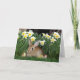 Very young bunny rabbit sits among the daffodils and protects his Easter egg finds. Cautions not to put all your eggs in one basket in the changeable or removable inside text.