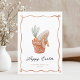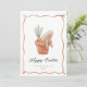 Celebrate Easter with this charming greeting card featuring a whimsical illustration of a bunny resting in a polka-dot flower pot with a carrot and greenery. The soft watercolor design and scalloped edges add a touch of elegance and playfulness, making it perfect for sending warm holiday wishes to family and friends.