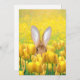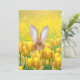 Fawn colored Flemish giant bunny peeking out from yellow tulips either hiding Easter eggs or looking for them